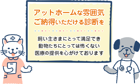 動物たちの痛みや不安の声に耳を傾けながらの診療を心がけています。